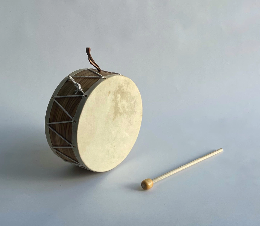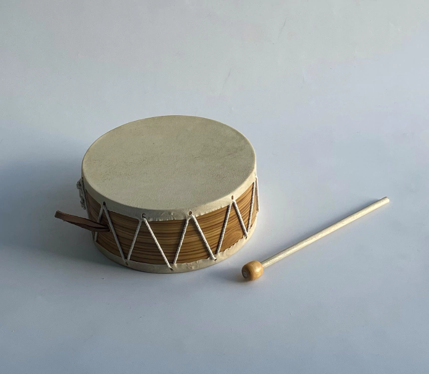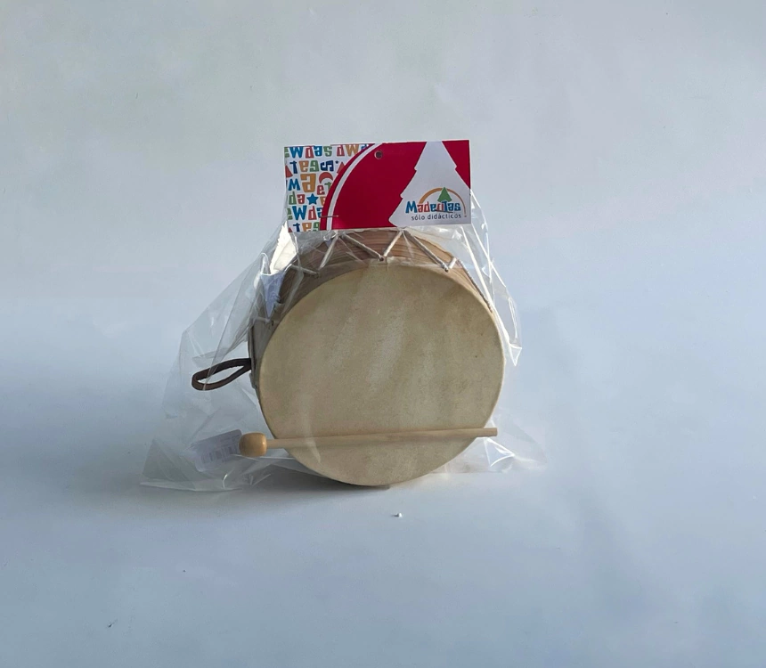 El bombo mide 16cm de diametro y 7cm de ancho, contiene una baqueta de 16,5 cm