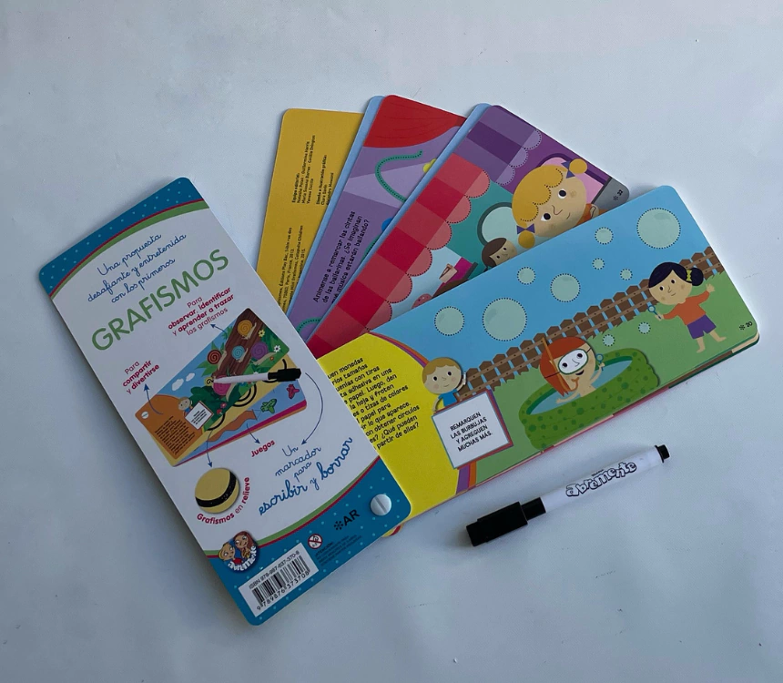Un libro con forma de abanico de gran tamaño que incluye un marcador para que puedan escribir y borrar cuantas veces quieran. Además podrán observar e identificar los grafismos en imágenes atractivas, aprender a trazarlos con soltura y reconocerlos con sus dedos en las páginas con relieve.