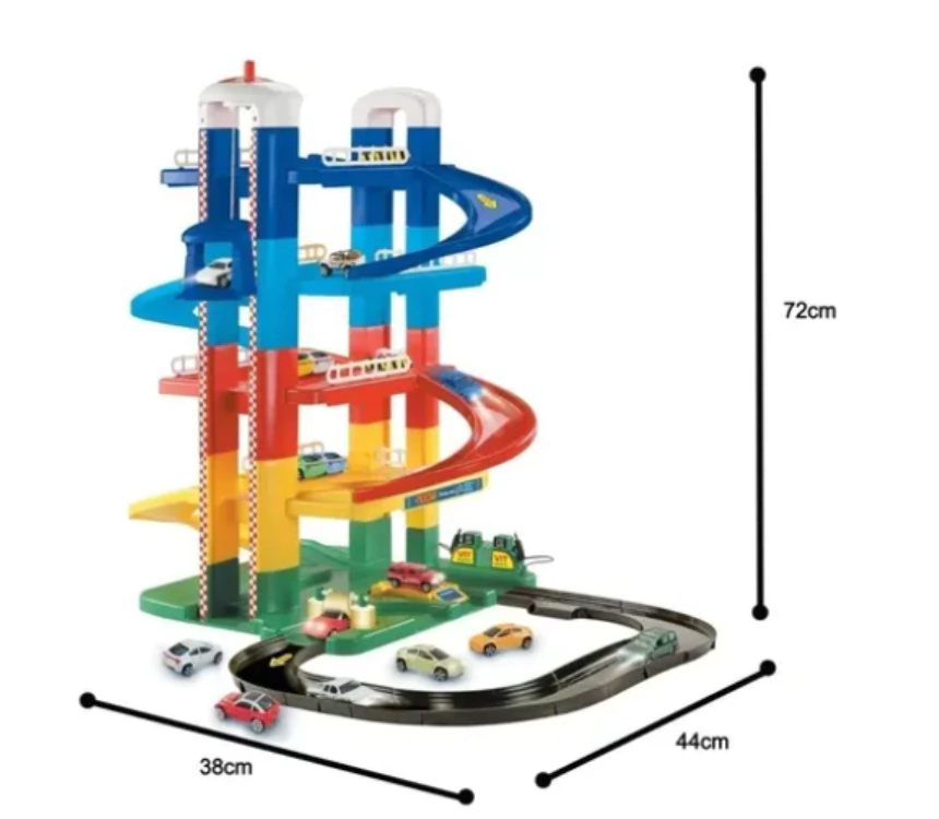 Contiene: 4 pisos,7 tramos de pista, elevador de autos, zona de surtidores, área de lavado, área de mecánica y rampa continúa. Incluye stickers