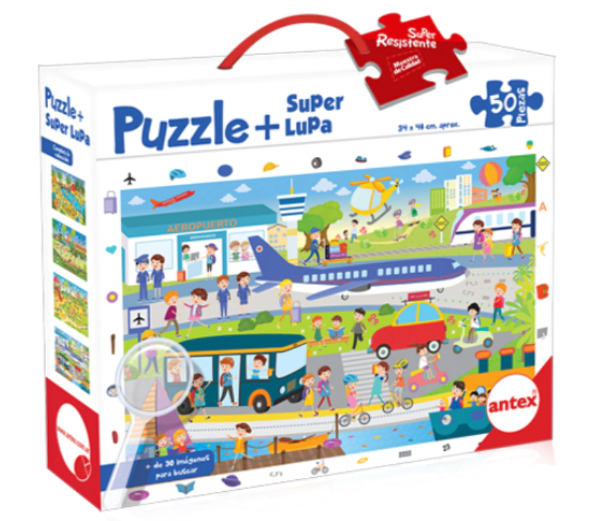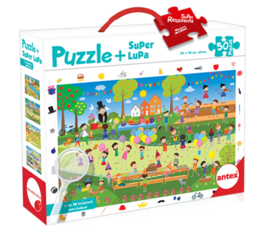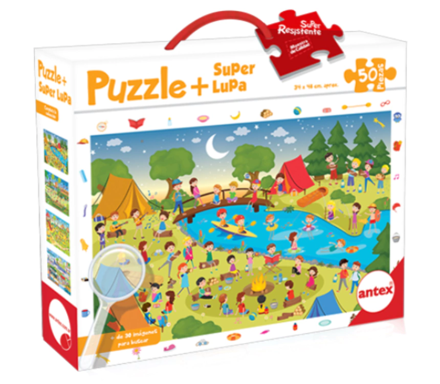 Rompecabezas con piezas de cartón resistentes. Incluye lupa para realizar el juego de búsqueda